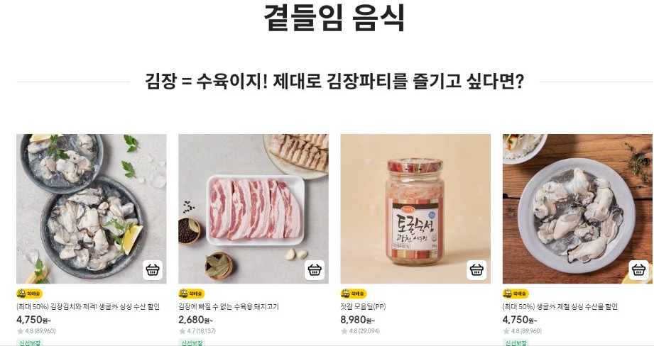 젓갈, 액젓, 설탕, 소금, 물엿, 고춧가루를 한데 모아서 쇼핑이 가능하며, 수육용 고기도 준비되어 있네요. 수육 통오겹 2kg을 2만 원대로 구매할 수 있습니다. 각종 농수산물의 구매를 한자리에서 할 수 있는 것뿐만 아니라, 리뷰를 바로 확인할 수 있어서 사람들의 선호도를 파악할 수 있어 편히 쇼핑을 했던 기억이 있습니다. 수육용 고기 리뷰인 경우에는 대체적으로 부드럽고 고소하다는 평가가 많았습니다.