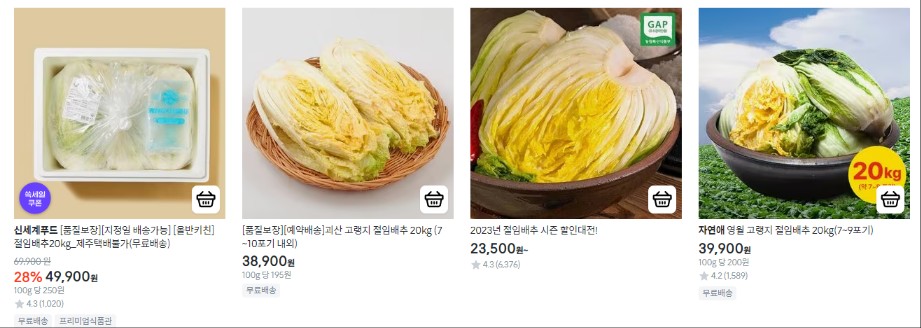 해남 절임배추 20kg(8~10 포기)는 4만 원대, 10kg (3~5 포기)는 2만 원 초반대로 구매 가능합니다. HACCP인증 국내 천일염을 사용한 배추들로 해남, 영월고랭지, 괴산, 강원도 등 브랜드 상품을 한데 모아 두었습니다. 절임배추뿐만이 아니라, 기타 식재료도 함께 구매 가능합니다. 알타리도 배송이 가능하며, 5kg을 3만 원대로 구매 가능합니다. 알타리는 5kg에 500g을 추가로 더 보내드리고 있으니, 총 5.5kg이 3만 원인 셈입니다.
