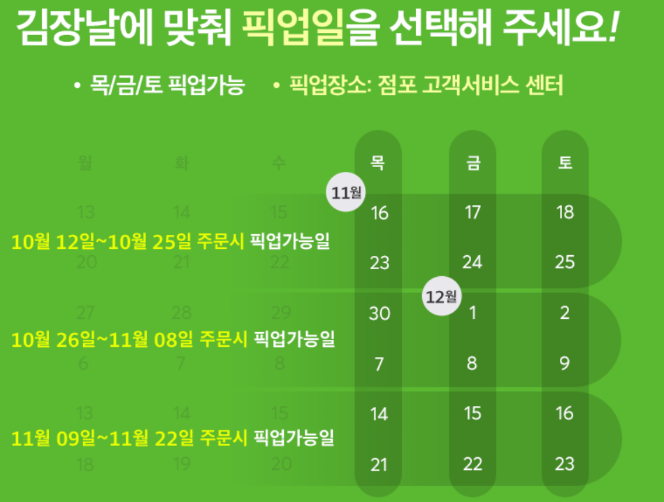 배추수령기간: 김장날에 맞춰서 날짜 선택하기. 요일은 목/금/ 토
