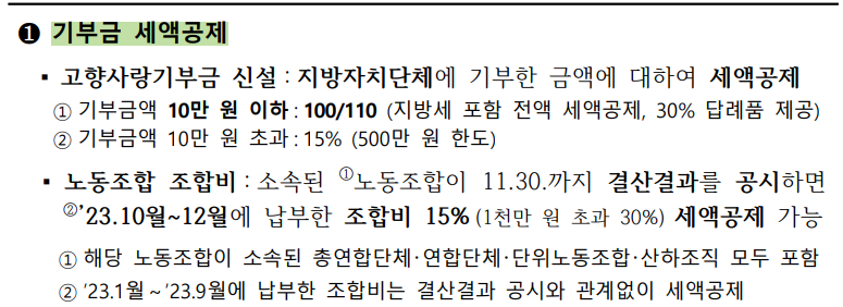 노동조합비는 23년 1월 ~ 9월까지 100% 소득공제가 되고, 10월 ~12월분은 15%가 공제됩니다. (1천만 원 초과 시에는 30%가 공제됨)
