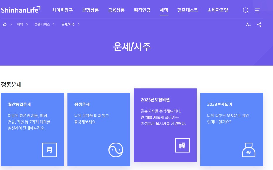 신한라이프에서 제공하는 무료운세 토정비결은 저도 종종 찾는 운세 사이트입니다. 아직 24년은 오픈 전이지만 월간, 평생운세 확인이 가능합니다. 좋은 말들을 많이 해주는 데, 한 해 시작하기에 좋은 기운을 얻어가셨으면 좋겠습니다.