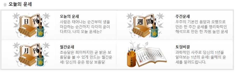 점을 전문으로 보는 웹싸이트입니다. 오늘운세, 신년운세와 더불어 주역/생활파트에는 혈액형 운세까지 볼 수 있는 특별함이 있네요.