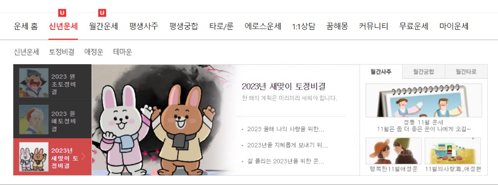 네이트도 아직 24년 새맞이 토정비결을 오픈하지 않았습니다만, 애정운과 테마운을 확인해 볼 수 있어요. 아직 23년이 끝나지 않았으니, 재미로 내 연인 미리 보기도 하고, 연애가능성을 알아본다던가, 인연을 찾아보는 건 어떨까요?