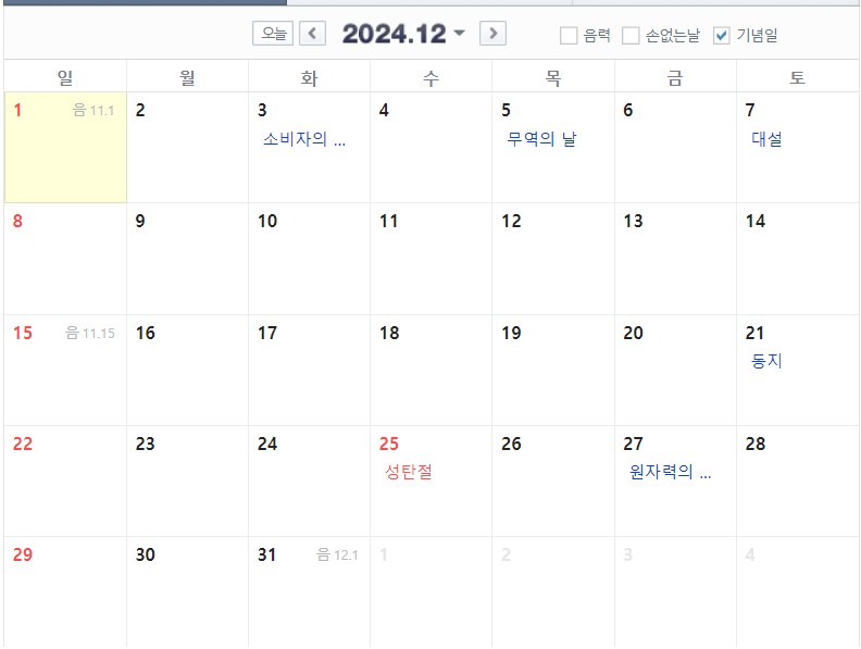 2024년 12월 25일 수요일은 크리스마스입니다. 월화 또는 목금 연차를 내면 주말 포함해 5일 연말 연휴를 보낼 수 있겠네요.